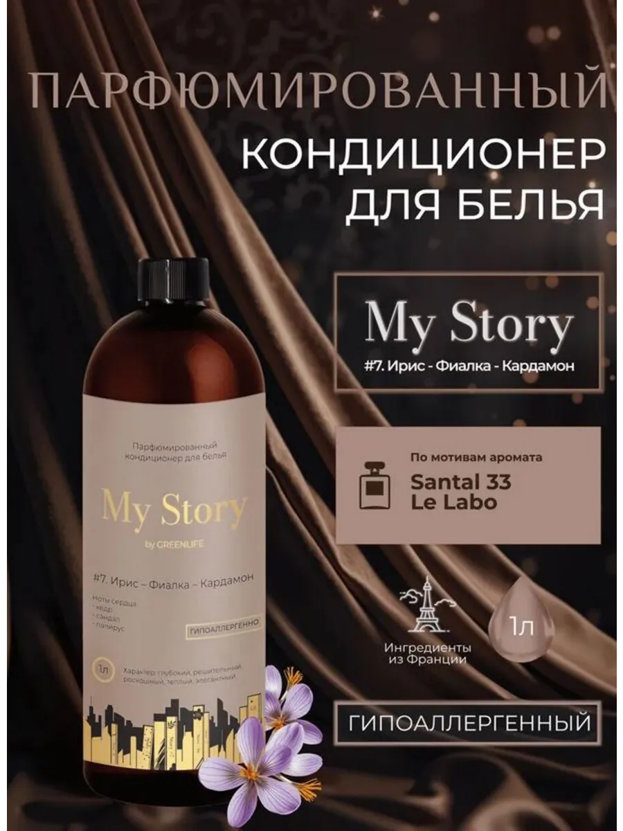 Выбирая парфюмированный кондиционер для белья My Story by Green Life с ароматом «Ирис Фиалка Кардамон (Santal 33)», вы получаете не просто средство для стирки белья, а элемент стиля и роскоши.