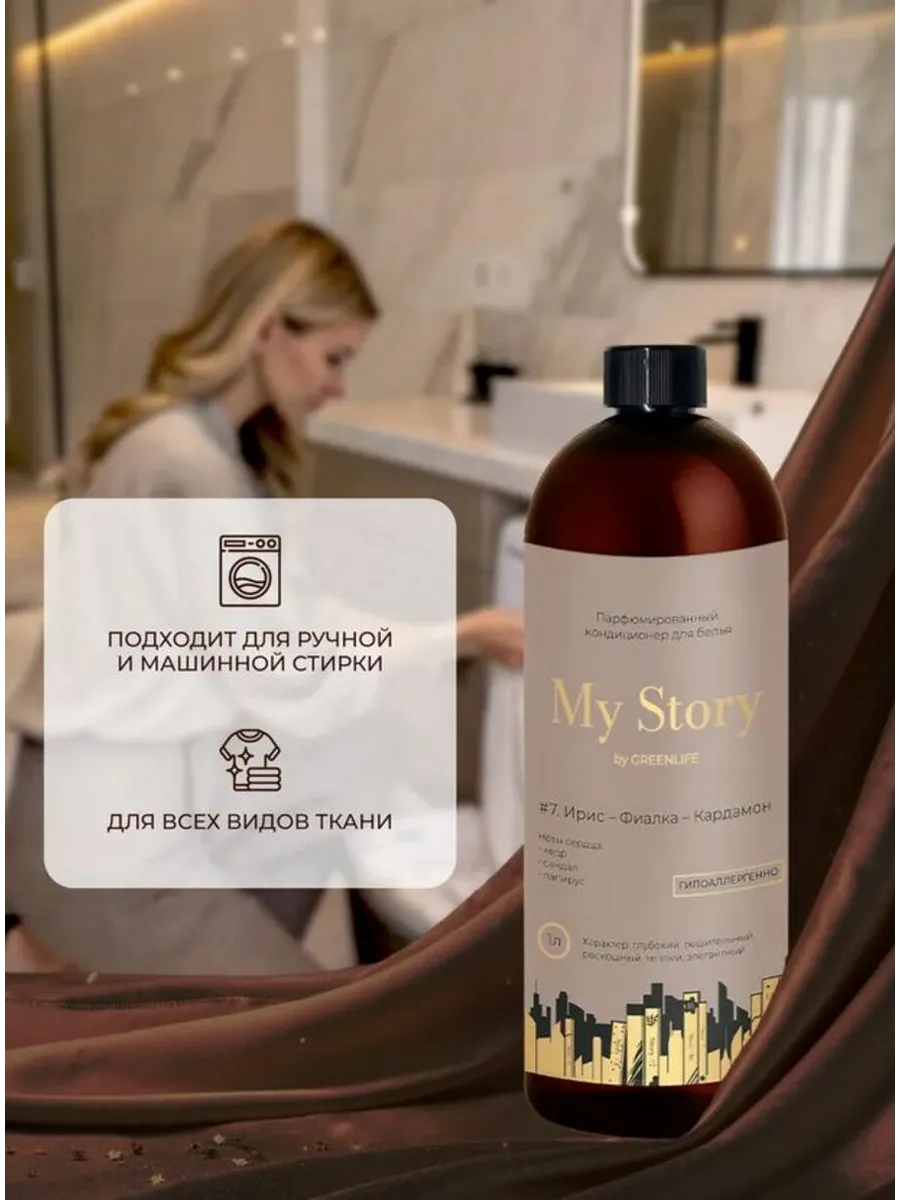 Парфюмированный гипоаллергенный кондиционер для белья My Story by Green Life – это гармония ухода и изысканного аромата, который превращает каждое средство для стирки белья в особый ритуал комфорта. Его формула бережно ухаживает за тканями: смягчает волокна, облегчает глажку, защищает от износа и помогает сохранить первоначальную красоту вещей.