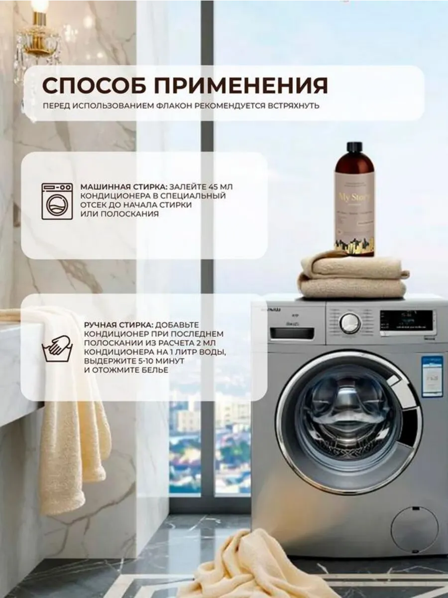 Использование геля и кондиционера для стирки одновременно усиливает эффект: бельё становится мягким, приятным на ощупь и дольше остаётся свежим. Для стирки черного белья кондиционер My Story особенно полезен — он помогает сохранить насыщенные оттенки, предотвращая выцветание. При этом средство идеально подходит и для стирки белья светлого, обеспечивая универсальный и бережный уход. Подходит для ручной и машинной стирки, придает ткани антистатический эффект.
