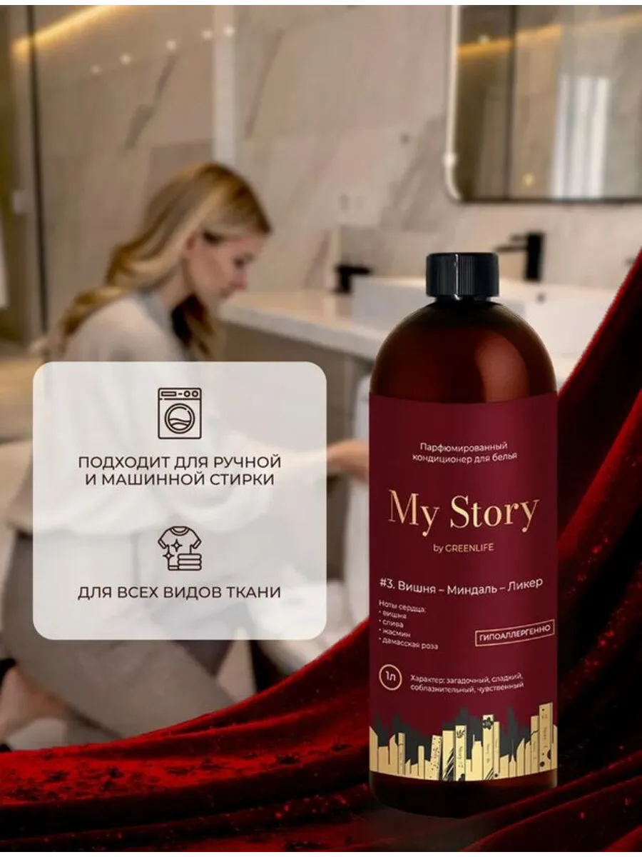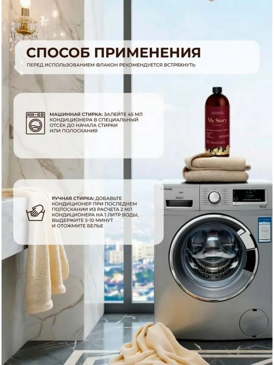 Кондиционер My Story гармонично сочетается с любым гелем для стирки, создавая идеальный баланс чистоты и аромата. После стирки белья вещи не только выглядят свежими, но и приобретают стойкий парфюмированный шлейф, который делает ваш повседневный уход за одеждой по-настоящему особенным.