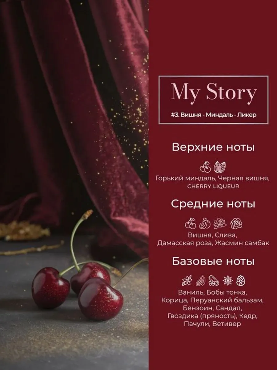 Отдельного внимания заслуживает парфюмерная композиция «Вишня Миндаль Ликер (Lost Cherry)». Сочные и дерзкие ноты спелой вишни сразу погружают в атмосферу соблазна. Их поддерживает нежная горчинка миндаля, придающая аромату изысканность и характер. Завершающим акцентом становится теплый ликёрный оттенок, обволакивающий ткани мягкостью и создающий ощущение уюта и роскоши. Такой аромат не просто остаётся на вещах, а становится частью вашего образа, превращая даже обычную стирку в удовольствие.