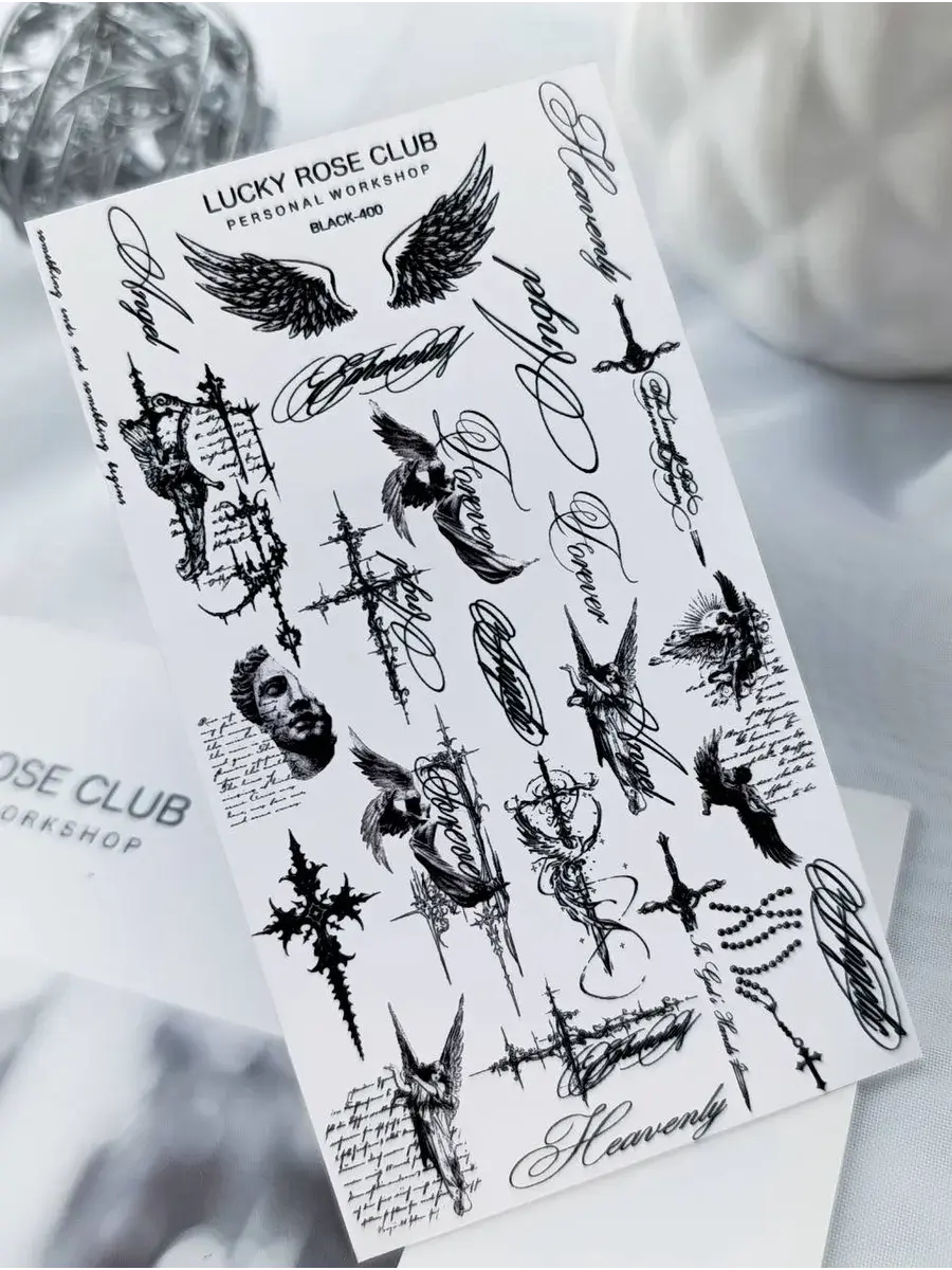 Стильные и модные слайдеры в стиле тату y2k с серебряными акцентами способны преобразить любой маникюр в нечто потрясающее. С их помощью вы быстро создадите уникальный дизайн, подходящий как для длинных, так и для очень длинных ногтей. Эти удобные элементы прекрасно сочетаются с любым покрытием: от классического лака до гель-лака, акрила и полигеля. Дизайны слайдеров подходят как для натуральных, так и для накладных ногтей.