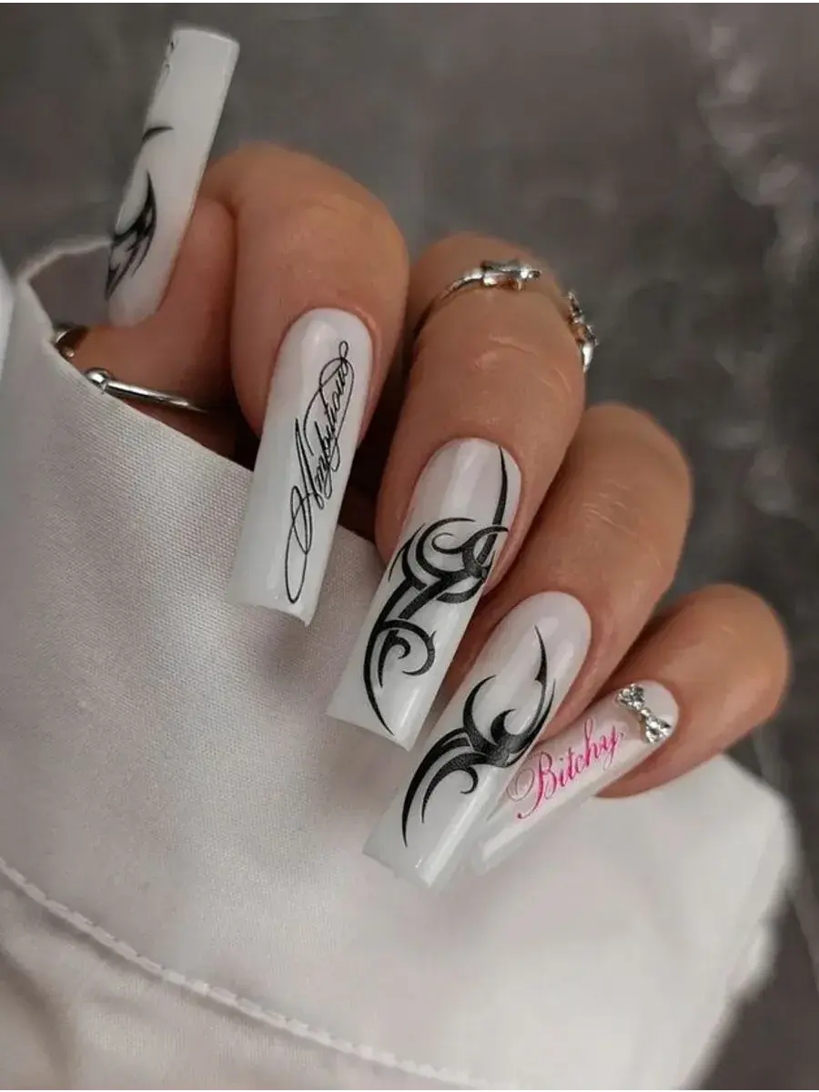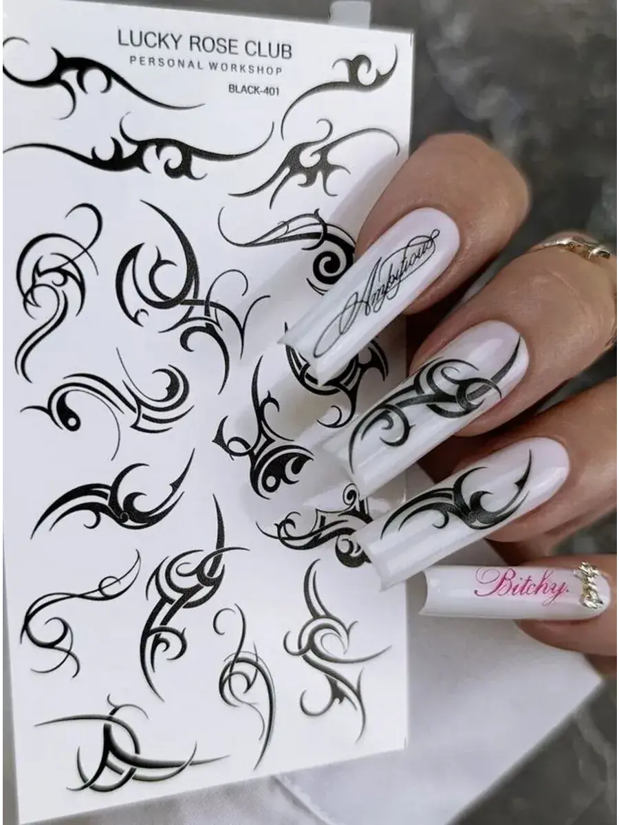Стильные и модные слайдеры в стиле тату y2k с серебряными акцентами способны преобразить любой маникюр в нечто потрясающее. С их помощью вы быстро создадите уникальный дизайн, подходящий как для длинных, так и для очень длинных ногтей. Эти удобные элементы прекрасно сочетаются с любым покрытием: от классического лака до гель-лака, акрила и полигеля. Дизайны слайдеров подходят как для натуральных, так и для накладных ногтей.