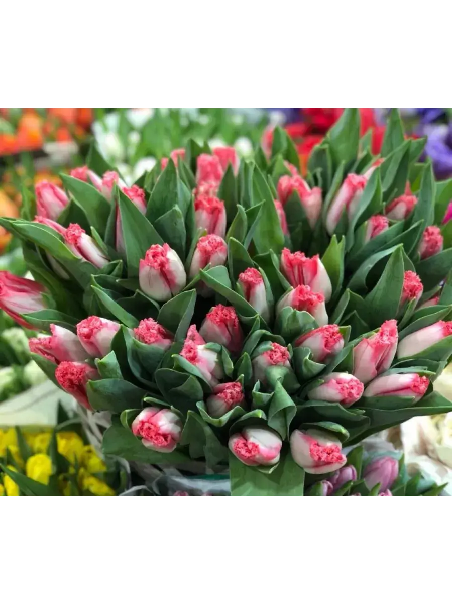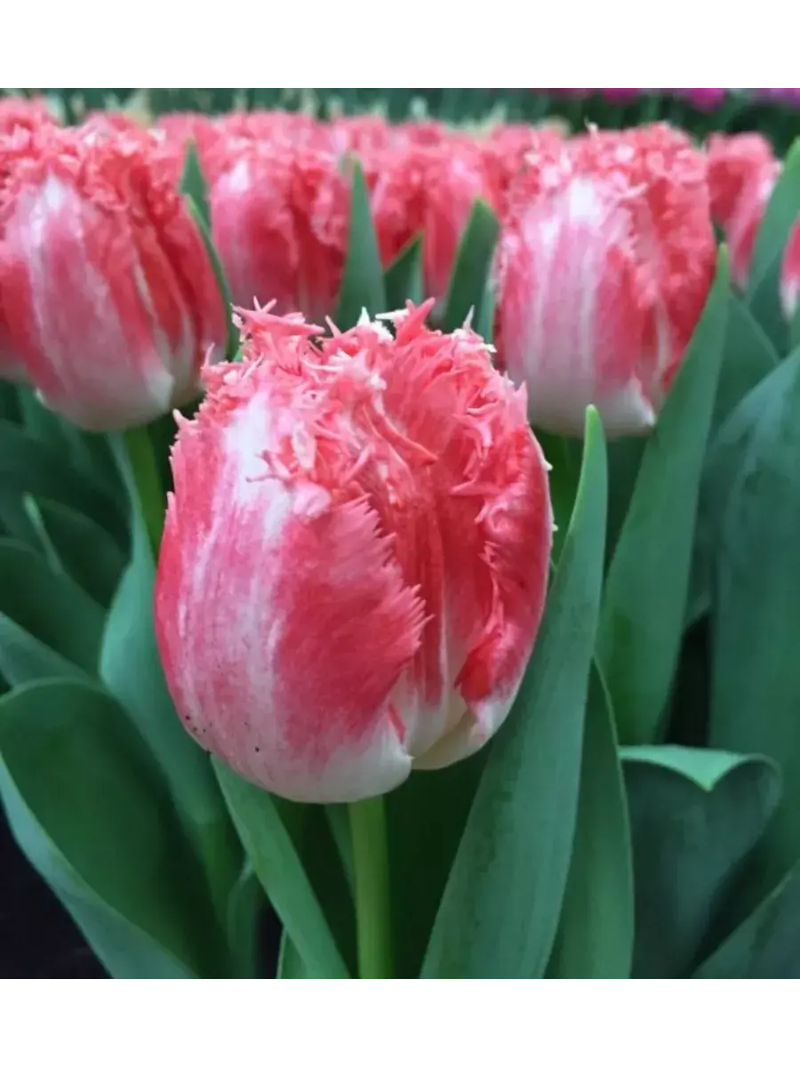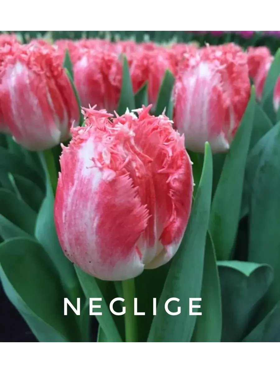 Тюльпан бахромчатый Неглиже – сорт с холодно-розовыми или ярко-алыми лепестками. Кайма такого же цвета. Бахрома игольчатая, такого же оттенка. Цветение происходит в мае. Он гармонично смотрится с другими яркими цветами красного оттенка. В солнечную погоду в цветах преобладает красный оттенок, а в вечерние – розовый. При этом чем он дольше цветёт – тем более красным становится! Бутоны источают приятный аромат. Прекрасно смотрятся в букетах и долго стоят в срезке. Диаметр бутона – около 11-12 сантиметров. Высота стеблей – около 40-50 сантиметров.