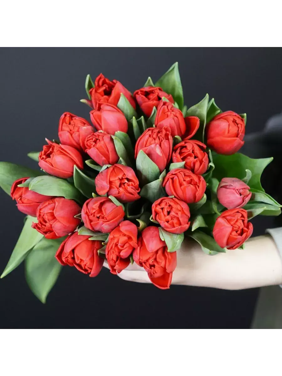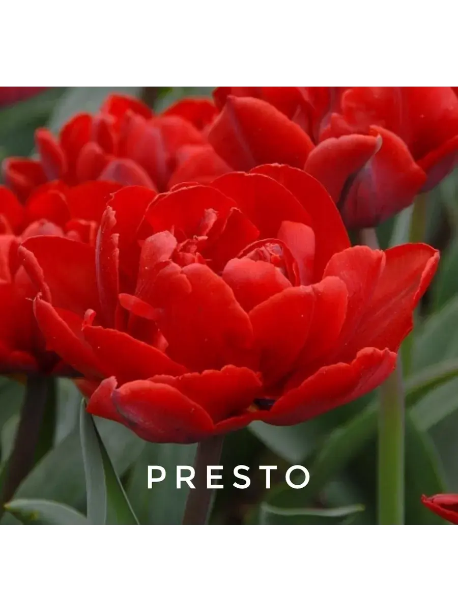 Тюльпан махровый Престо распускается крупным цветком, содержащем в плотном бутоне множество изящных лепестков насыщенного красного цвета. Долгое цветение продолжается весь май.