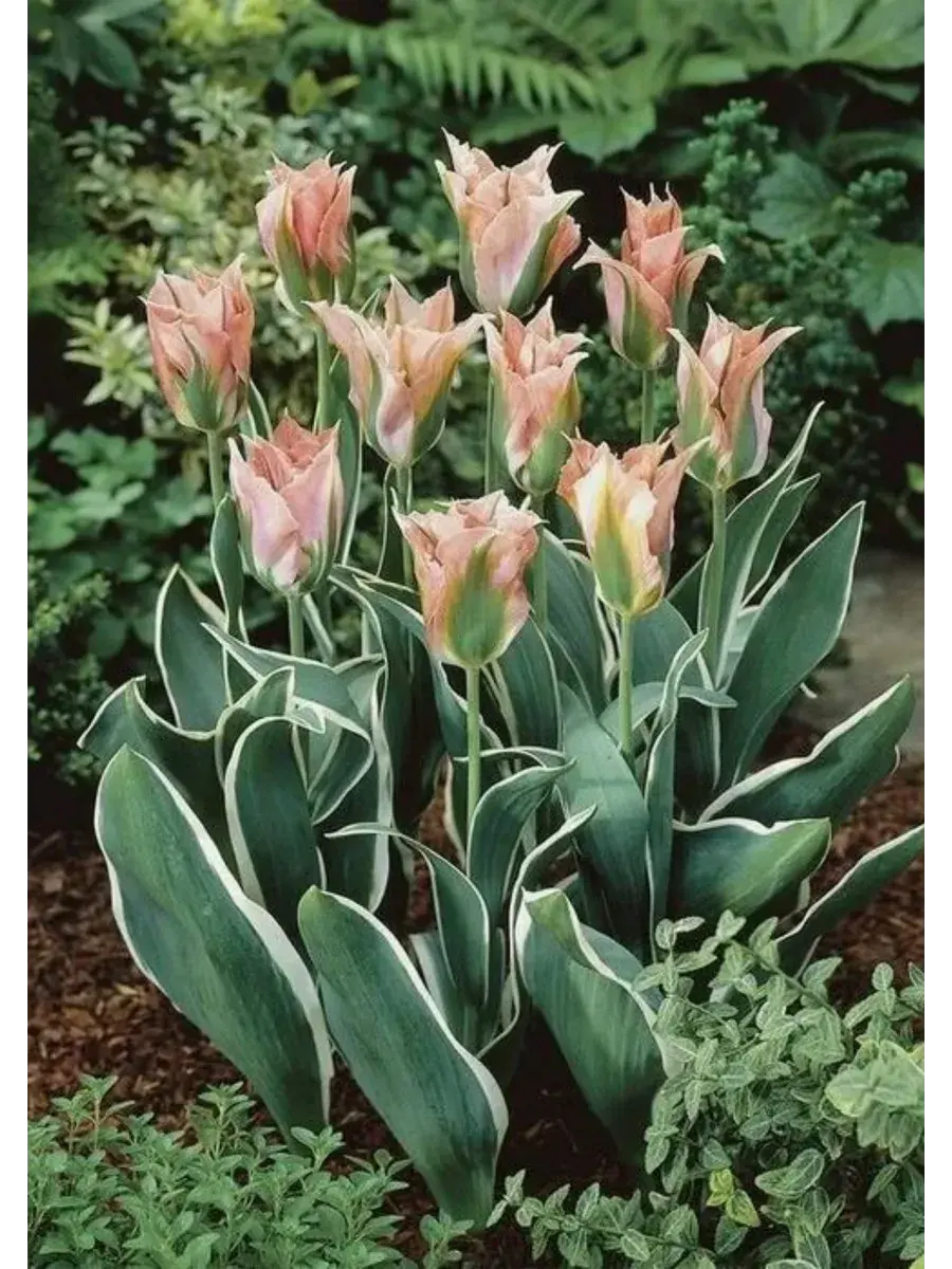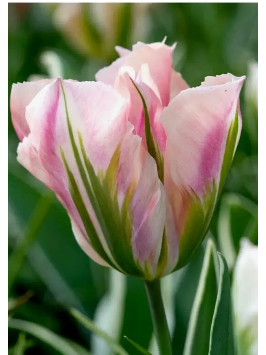 Цветки: некрупные, достигают в высоту около 6–7 см, но их окрас делает их весьма декоративными. Лепестки пёстрые: по центру — яркий, насыщенный зелёный штрих, а края — нежно-розоватого оттенка.