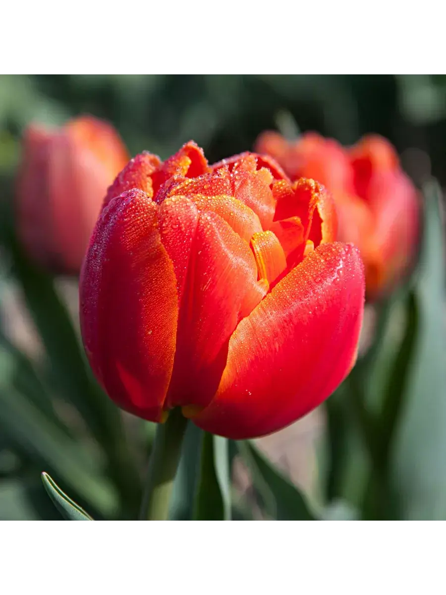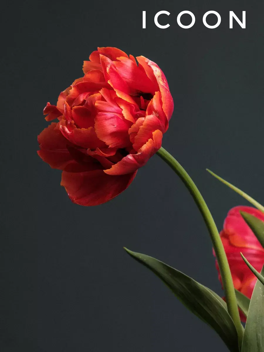 Тюльпан махровый поздний ICOON по форме практически неотличим от пиона. Бутон даже из самого дальнего угла сада привлекает к себе внимание красно-оранжевой пылающей окраской. Этот сорт тюльпанов может расти до 60 см в высоту.