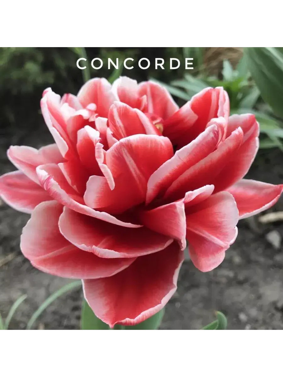 Тюльпан махровый Конкорд цветет большими цветками красно-белой расцветки уже в апреле. В полном роспуске его большие заостренные лепестки составляют бутоны, похожие на розу.